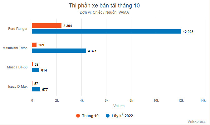 Tính doanh số cộng dồn từ đầu năm 2022 đến nay, Ranger bán nhiều nhất và dẫn đầu với 12.028 xe. Triton xếp thứ hai với lũy kế cả năm đạt 4.371 xe. Hai vị trí tiếp theo lần lượt thuộc về Isuzu D-Max và Mazda BT-50, tương ứng với doanh số 677 và 614 xe.