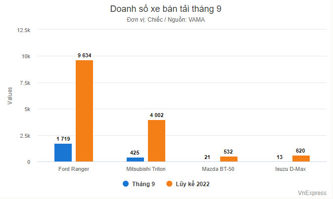 Xếp hạng lũy kế tháng 9 không thay đổi so với tháng 8. Ranger bán 9.634 chiếc trong năm 2022, tính trung bình tháng khoảng 1.070 xe giao đến tay khách hàng. Tiếp đến là Triton với 4.002 xe, trung bình tháng khoảng 445 chiếc. D-Max bán 620 chiếc, trung bình tháng khoảng 69 xe. Cuối cùng là BT-50 với lũy kế 532 chiếc, trung bình tháng khoảng 59 xe.